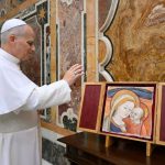 O Papa abençoa uma imagem da Mãe do Bom Conselho doada pelos peregrinos da Letônia
