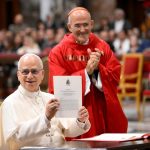 O Papa Leão XIV mostra a Carta Apostólica “Desenhar novos mapas de esperança” após a assinatura na Basílica Vaticana. Ao lado, o cardeal José...