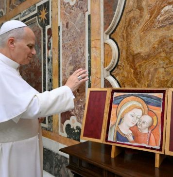 O Papa abençoa uma imagem da Mãe do Bom Conselho doada pelos peregrinos da Letônia